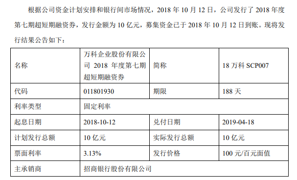 10月12日晚,万科A发布公告称,公司发行了2018年度第七期超短期融资券,发行金额为10亿元,募集资金已于10月12日到账。