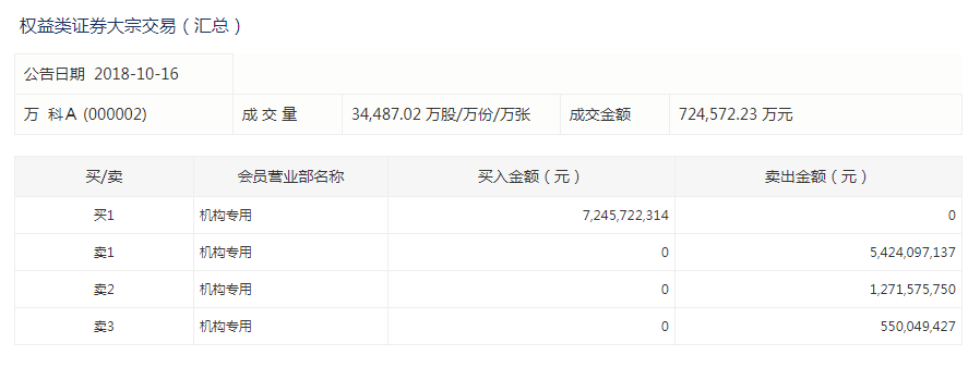 10月16日,万科A出现72.46亿元大宗交易,买入、卖出均为机构席位,成交价均为21.01元/股。万科A今日高开低走,收跌2.14%,报21.01元,成交额8.54亿元。