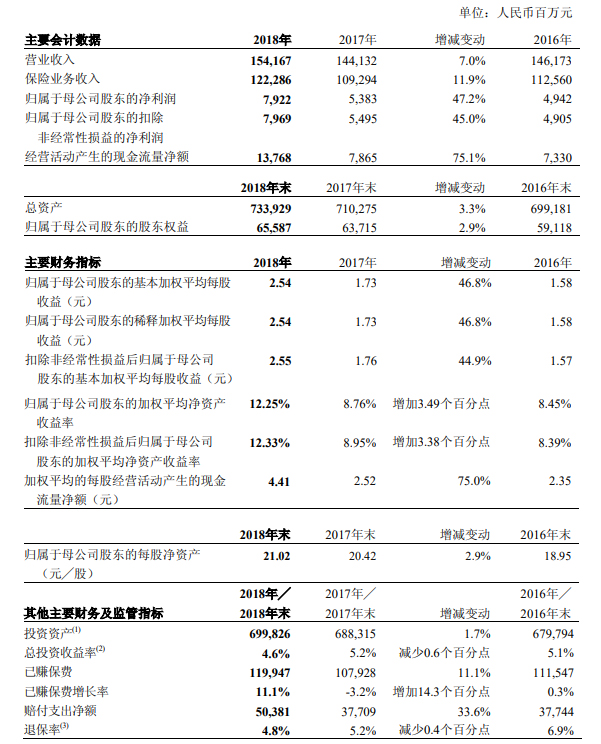 新华保险表示,整体来说,公司在 2018 年取得了较好的成绩。截至 2018 年底,公司总资产达到 7,339.29 亿元,同比提升 3.3%。2018 年度,实现归属于母公司股东的净利润 79.22 亿元,同比提升 47.2%;实现一年新业务价值122.10 亿元,同比增长 1.2%。公司全年实现续期保费 958.60 亿元,同比增长 24.9%,推动公司原保险保费收入实现 1,222.86 亿元,同比增长11.9%。截至 2018 年底,公司净资产达到 655.87 亿元,同比增长 2.9%。