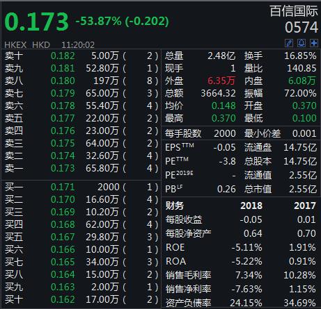 5月20日早盘,港股百信国际开盘后不久闪崩,股价一度跌至0.1港元,截至发稿,跌幅超53%,市值2.55亿港元。