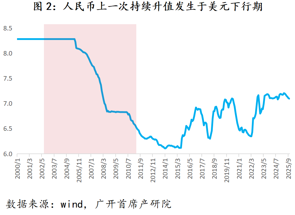 第一,当前美元处于新一轮周期的下行阶段。自上世纪70年代以来,美元指数共经历了两轮半周期。市场普遍认为,2020年本应为新一轮美元周期的顶点,但受新冠疫情、俄乌冲突等“黑天鹅”事件连续冲击,美元的避险需求被不断放大,叠加美联储激进加息和推迟降息等因素影响,直到2025年下半年,美元下行态势才逐步确立。从历史经验看,当美元指数处于周期中的下行长通道时,人民币持续升值的阻力通常较少。