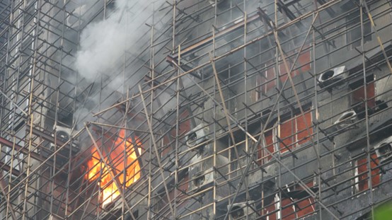 香港警方展开调查,发现建筑物外墙有保护网、防水帆布、塑料布,疑未符合防火标准。