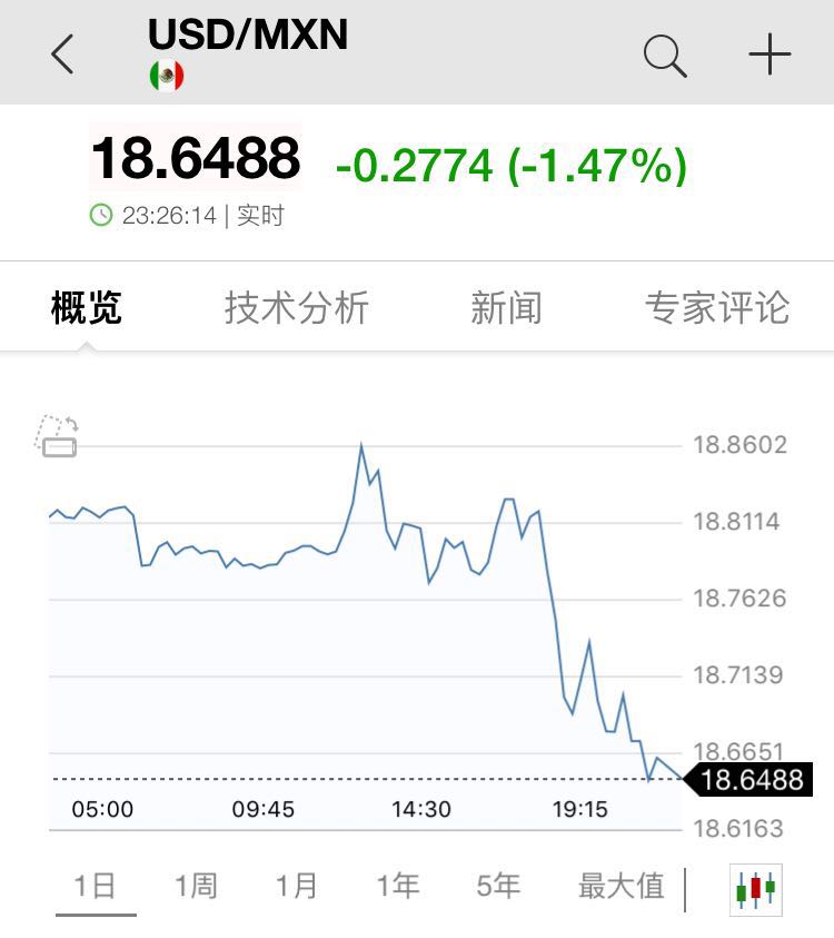 23:22【美墨已经达成贸易协议】据CNBC消息,特朗普宣布,美国与墨西哥已经达成贸易协议,该协议将取代北美自由贸易协定(NAFTA)。墨西哥总统也表示,贸易协议利好美墨两国,希望加拿大能加入(美墨)贸易协议。消息公布后,墨西哥比索兑美元持续上扬,截至目前涨幅近1.5%。
