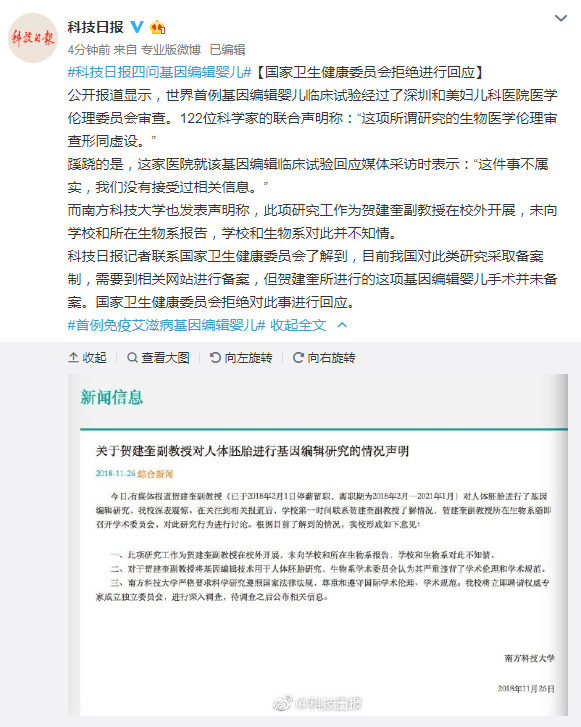 18:59【国家卫生健康委员会拒绝回应“基因编辑婴儿”事件】关于世界首例基因编辑婴儿临床试验,记者联系国家卫生健康委员会了解到,目前我国对此类研究采取备案制,需要到相关网站进行备案,但贺建奎所进行的这项基因编辑婴儿手术并未备案。国家卫生健康委员会拒绝对此事进行回应。(科技日报)