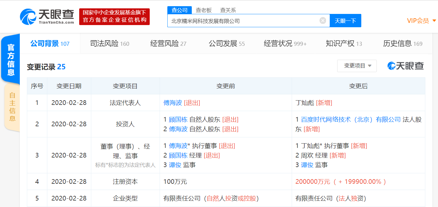 15:40【百度糯米注册资本增至20亿,傅海波卸任法定代表人】天眼查数据显示,2月28日,百度糯米的运营主体北京糯米网科技发展有限公司发生工商变更,傅海波卸任法定代表人、执行董事,丁灿彪接任。另外,该公司的注册资本由原来的100万元新增为20亿元,增幅为199900%。原自然人股东顾国栋、傅海波退出,新增法人股东——百度贴吧的运营主体百度时代网络技术(北京)有限公司。同时,该公司企业类型由原来的有限责任公司(自然人投资或控股)变为有限责任公司(法人独资)。