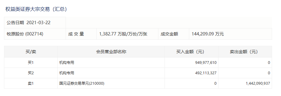 16:28【牧原股份现14.4亿元大宗交易,买方均为机构席位】据深交所盘后交易数据显示,牧原股份今日出现两笔合计14.4亿元的大宗交易,成交价为104.29元,牧原股份今日收盘价为104.94元,买方均为机构席位,卖方为国元证券交易单元。