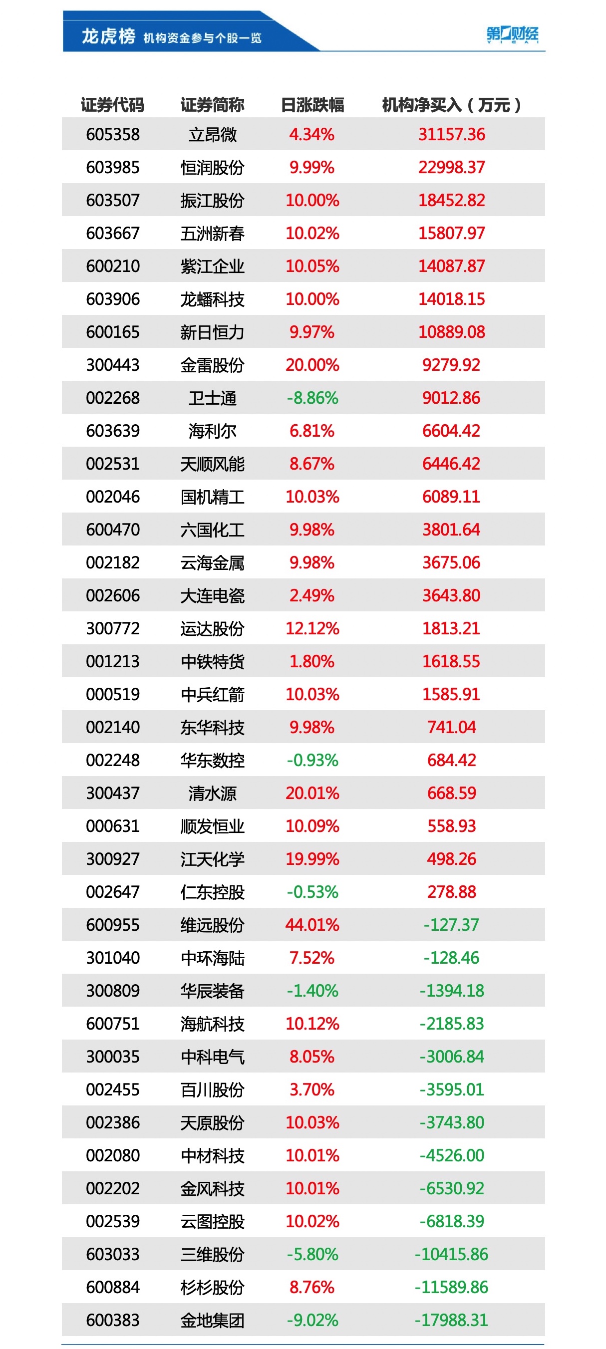 当天机构净买入前三的股票分别是立昂微、恒润股份、振江股份,净买入金额分别是3.12亿元、2.30亿元、1.85亿元。