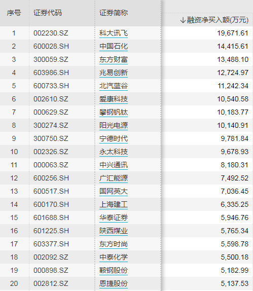 08:53【杠杆资金重仓股曝光 科大讯飞居首】据Wind统计显示,9月29日共有815只个股获融资净买入,净买入金额在千万元以上的有147只,8只个股融资净买入额超1亿元。科大讯飞获融资净买入额居首,当日净买入1.97亿元。中国石化、东方财富、兆易创新分别获融资净买入1.44亿元、1.35亿元、1.27亿元。中远海控、太阳能、兴发集团、中国石油遭净卖出居前,金额分别为2.77亿元、2.76亿元、2.45亿元、2.29亿元。
