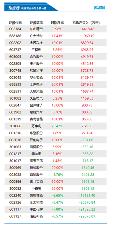当天机构净买入前三的股票分别是东山精密、广大特材、金风科技,净买入金额分别为1.44亿元、1.11亿元、8830万元。