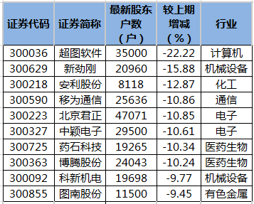 10:49【8只创业板股股东户数降超10%】统计显示,135只创业板股公布了11月20日股东户数,与上期(11月10日)比,股东户数下降的有63只,其中股东户数降幅超一成的有8只。股东户数降幅较多的有超图软件、新劲刚等股。进一步统计,有13只创业板股筹码呈连续集中的态势,相比之前各期,股东户数连续减少3期以上,股东户数最多已连降21期。尤安设计最新股东户数为22775户,连续减少21期,累计降幅为43.14%。(数据宝)