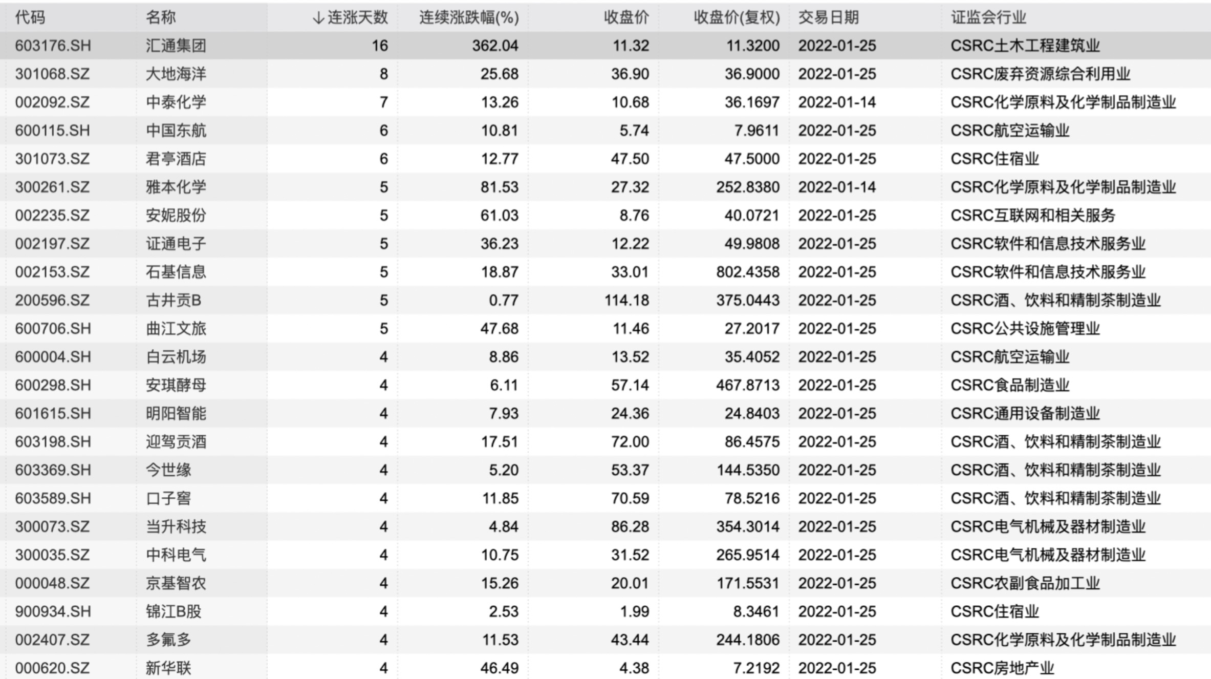 15:30【23只个股连涨4日及以上 这只股累计上涨362%】据统计,截至1月25日收盘,两市共有23只个股连涨4日及以上,其中汇通集团连涨16天累计上涨362%,大地海洋、中国东航等个股在列。同时,两市共有24只个股连跌9日及以上,其中沐邦高科、恒瑞医药分别累跌31.52%、16.24%。