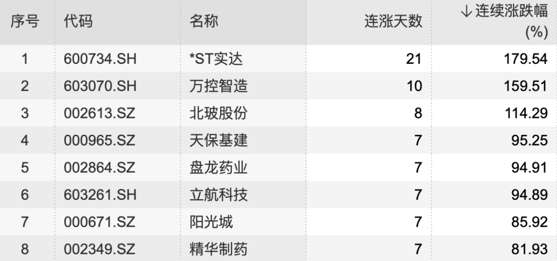 09:03【64股连续上涨超7日 这两只个股股价翻番】Wind数据显示,截至3月24日收盘,有64只个股连续上涨7个交易日及以上。其中,*ST实达连收21个涨停板后停牌核查,期间累计涨幅近180%。万控智造连续上涨10天,期间累计涨幅159.51%。北玻股份连续上涨7天,累计涨幅也超过100%。