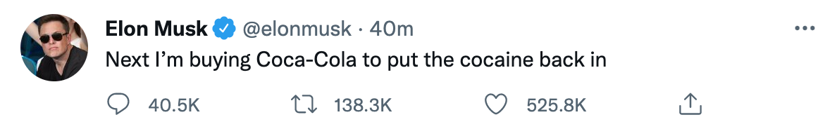 09:39【马斯克:接下来我要收购可口可乐公司,把可卡因重新加进去】4月28日,特斯拉CEO马斯克发布推特称,将收购美国消费品巨头可口可乐公司。“接下来我要收购可口可乐公司,再把可卡因重新加进去。”