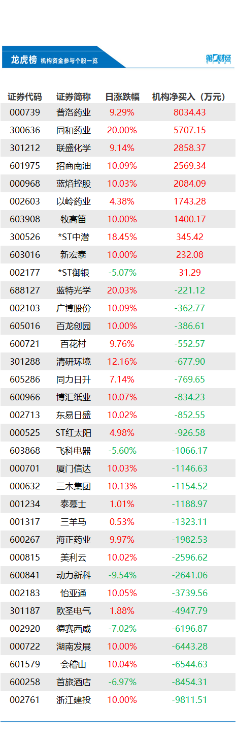 当天机构净买入前三的股票分别是普洛药业、同和药业、联盛化学,净买入金额分别是8034万元、5707万元、2858万元。