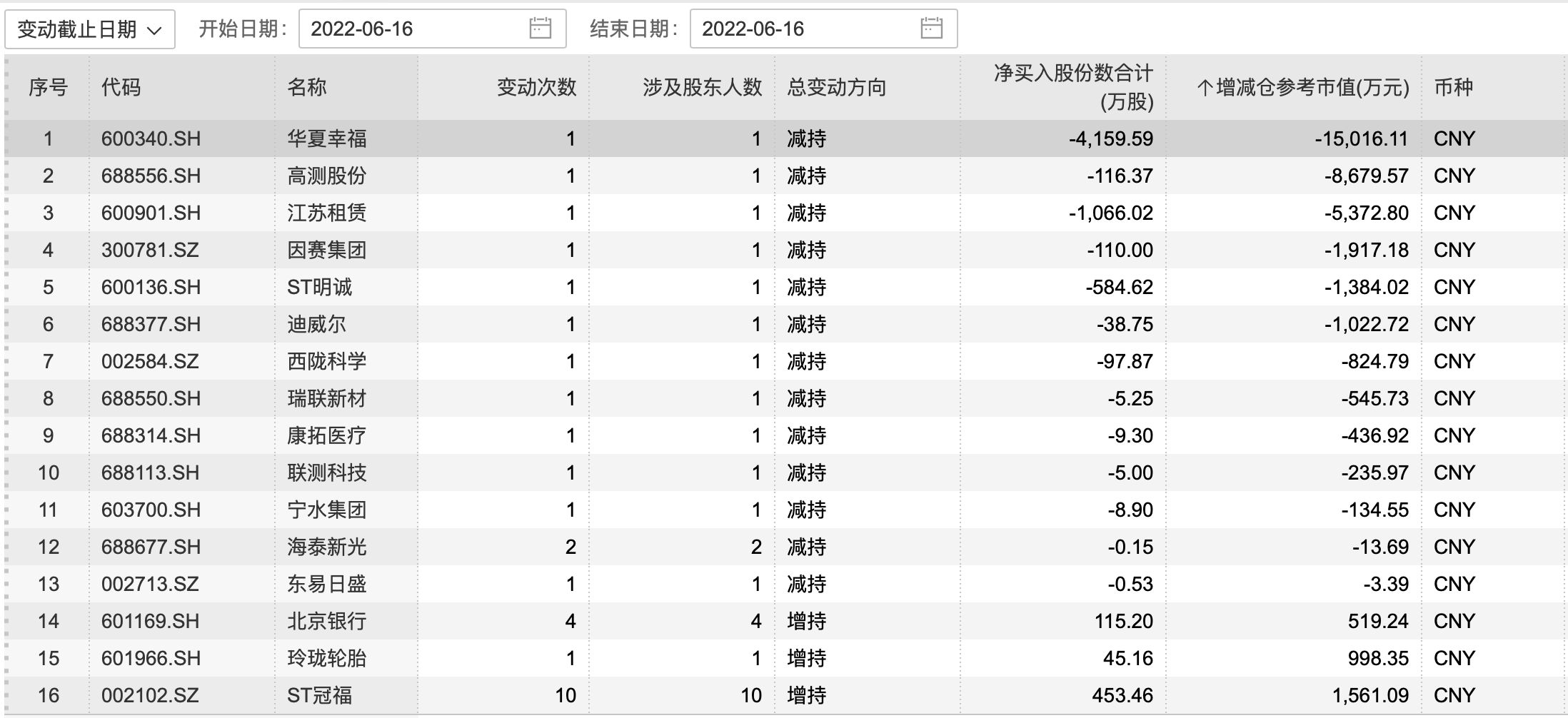08:30【13家上市公司股票遭重要股东减持,华夏幸福减持金额最高】Wind数据显示,按变动截止日期为基准,6月16日,3家上市公司股票获重要股东增持,ST冠福重要股东共计增持453.46万股,增持金额为1561.09万元;共有13家上市公司股票遭重要股东减持,减持金额最高的为华夏幸福,重要股东共计减持4159.59万股,减持金额约为1.5亿元。