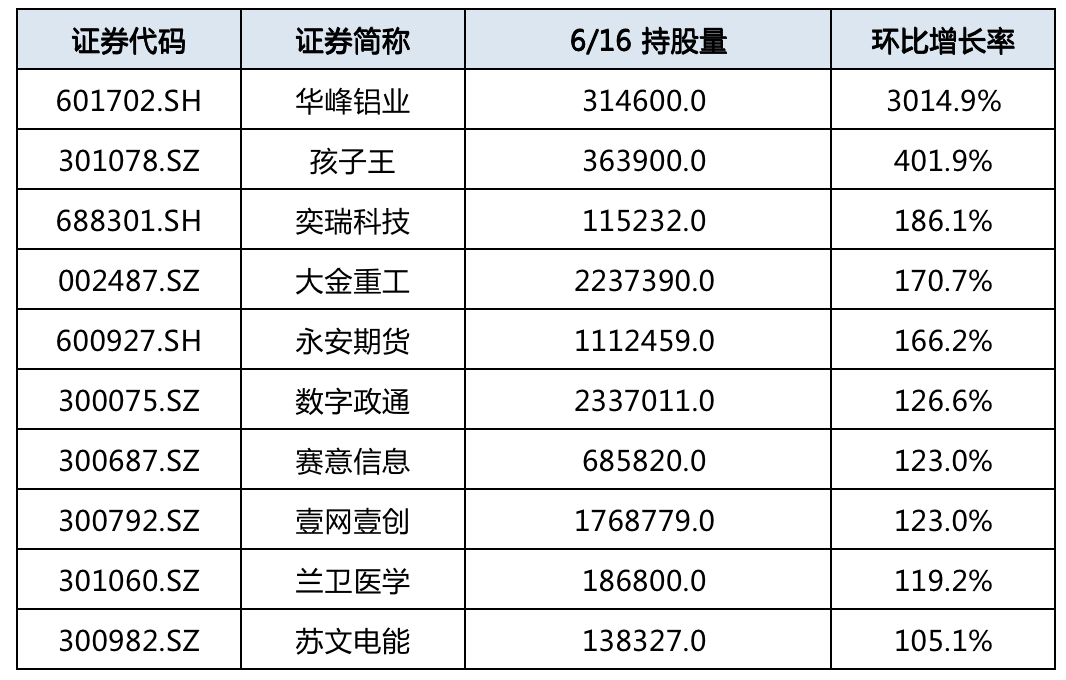 08:35【32股获陆股通增仓超50% 华峰铝业增幅最大】Wind统计显示,截至6月16日,共有892只个股获陆股通增仓。其中,持股量环比增幅在50%以上的共有32只,环比增幅最大的是华峰铝业,陆股通最新持有31.5万股,持股量较上一交易日环比增幅达3014.85%;环比增幅较大的还有孩子王、奕瑞科技、大金重工、永安期货、数字政通等股。