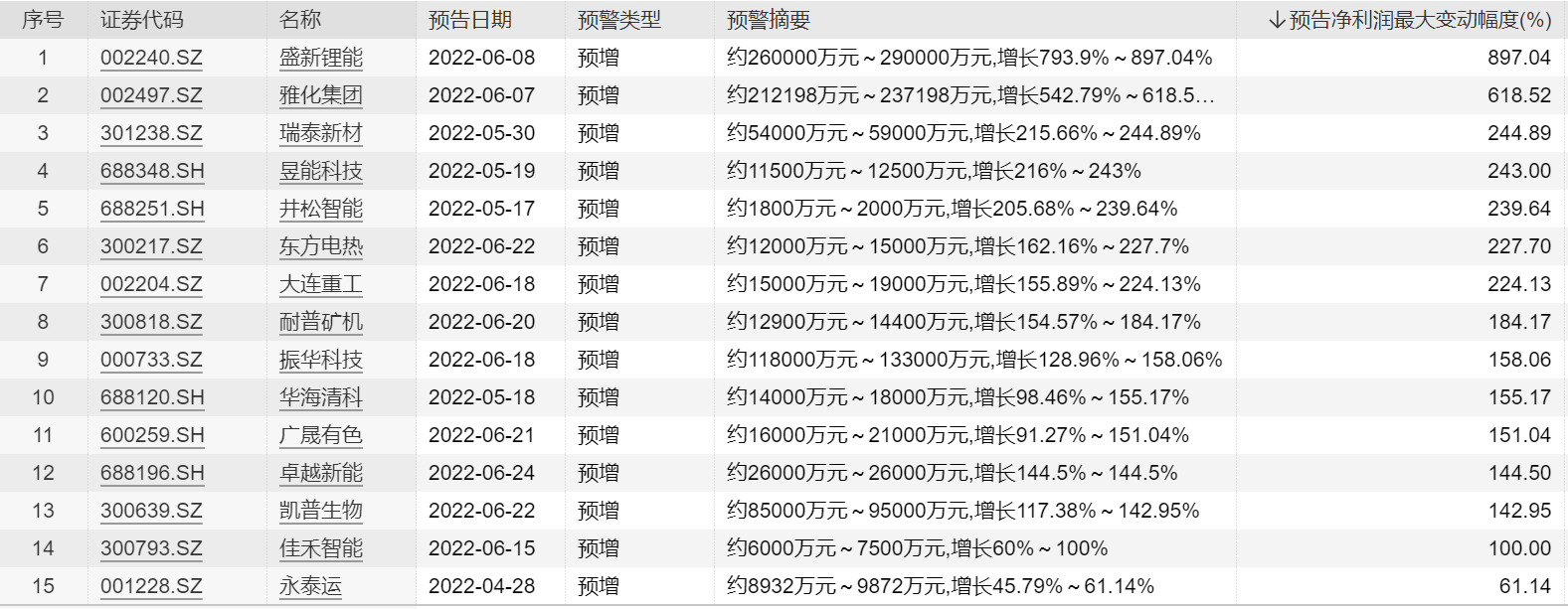 20:53【中报业绩预增股出炉 这只锂电股净利预增近900%】Wind数据显示,截至今日,共有51家上市公司披露2022年中报预告,其中有17家公司业绩预增,锂电股盛新锂能预计净利同比增897%居首,雅化集团净利最高同比预增618%,瑞泰新材、昱能科技、劲松智能、东方电热、大连重工净利均同比预增超200%。