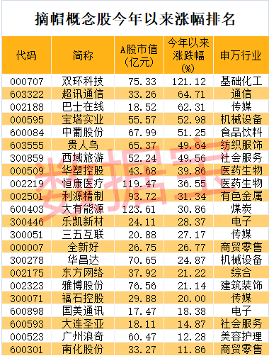 13:53【摘帽概念火了,最牛股2年涨超8倍,融资客加码锂矿巨头】数据宝统计,A股摘帽概念股中,截至7月4日收盘,超七成年内累计涨幅跑赢同期沪深300指数。双环科技、超讯通信、巴士在线、宝塔实业、中葡股份等累计涨幅达到50%以上。双环科技是摘帽股中唯一一只翻倍的股票,该股今年以来累计涨幅达到121.12%。与过去两年内低点相比,该股最大涨幅达到8.6倍。