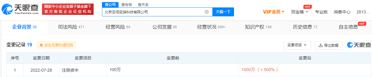 13:14【字节旗下懂车帝增资至1000万 增幅900%】天眼查App显示,近日,懂车帝关联公司北京空间变换科技有限公司发生工商变更,注册资本由100万人民币增至1000万人民币,增幅达900%。该公司成立于2016年3月,法定代表人为李飞,经营范围含技术推广服务;洗车服务;互联网信息服务;从事互联网文化活动;互联网信息服务等,由今日头条有限公司全资持股。