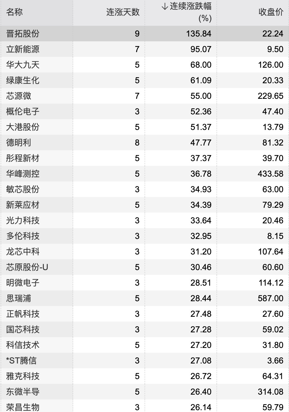 15:25【40只个股连续上涨5个交易日及以上 这只芯片股收获4连板】Wind数据显示,截至8月5日收盘,有40只个股连续上涨5个交易日及以上,其中晋拓股份连续上涨9个交易日,累计涨幅达135.84%;德明利连续上涨8日,芯源微、鼎龙股份、盛美上海、立新能源均累计上涨7个交易日。此外,大港股份已连续上涨5日,累计涨幅51.37%,该股已收获4连板。