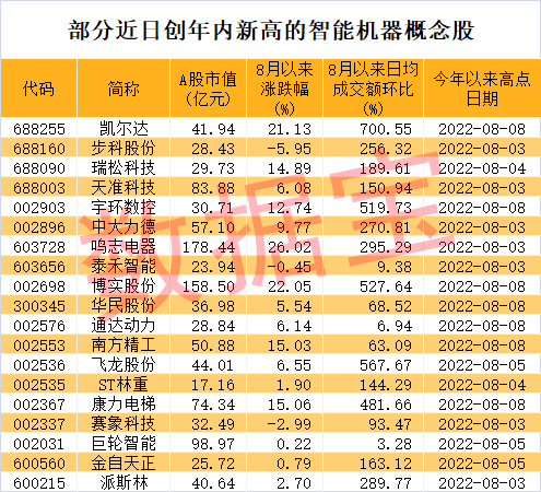 12:37【世界机器人大会即将召开,放量滞涨绩优股出炉】2022世界机器人大会将于8月18日至21日在北京亦创国际会展中心亮相。近期A股市场智能机器板块热度明显上升。8月以来共有45只概念股盘中股价创下年内新高。剔除近一个月上市的次新股,超六成概念股8月份以来日均成交额环比增长,103只股票日均成交额环比增幅超过50%。