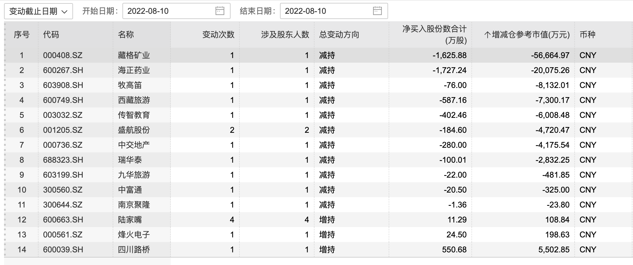 08:28【11家上市公司股票遭重要股东减持,藏格矿业减持金额最高】Wind数据显示,按变动截止日期为基准,8月10日,3家上市公司股票获重要股东增持,四川路桥重要股东共计增持550.68万股,增持金额为5502.85万元;共有11家上市公司股票遭重要股东减持,减持金额最高的为藏格矿业,重要股东共计减持1625.88万股,减持金额约为5.67亿元。