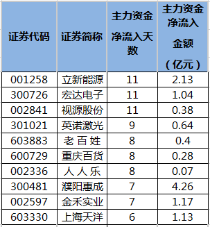 08:32【主力资金连续5日以上持续净流入59股】截至8月10日收盘,沪深两市共有59只个股连续5个交易日以上获主力资金持续净流入。连续流入天数最多的是立新能源、宏达电子、视源股份均已连续11个交易日净流入。连续净流入天数较多的还有英诺激光、老百姓、重庆百货、人人乐、濮阳惠成,分别获9个、8个、8个、8个、7个交易日净流入。 (数据宝)