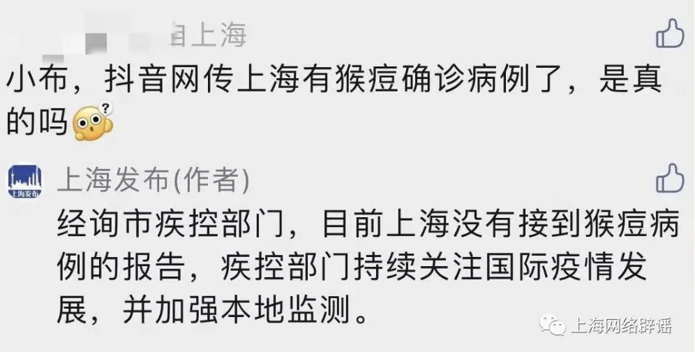 17:02【上海发布:“前滩出现猴痘了”?目前上海没接到猴痘病例报告】今日,圈群流传一则聊天记录称上海“前滩出现猴痘了”,其他社交平台也有类似传言。对此,上海发布在回复评论区相关留言时表示,经询市疾控部门,目前上海没有接到猴痘病例的报告,疾控部门持续关注国际疫情发展,并加强本地监测。 (上海网络辟谣)