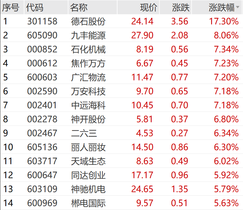 16:16【今日共有23股涨停破板】Wind数据显示,今日A股约2000只个股上涨,共69只个股涨停。今日共有23只个股涨停破板,其中德石股份涨超17%,九丰能源涨超8%,石化机械、焦作万方、广汇物流、万安科技、中远海科均涨超7%;今日共有3只个股跌停开板,东旭蓝天跌超8%,*ST雪发、ST东洋均跌超4%。