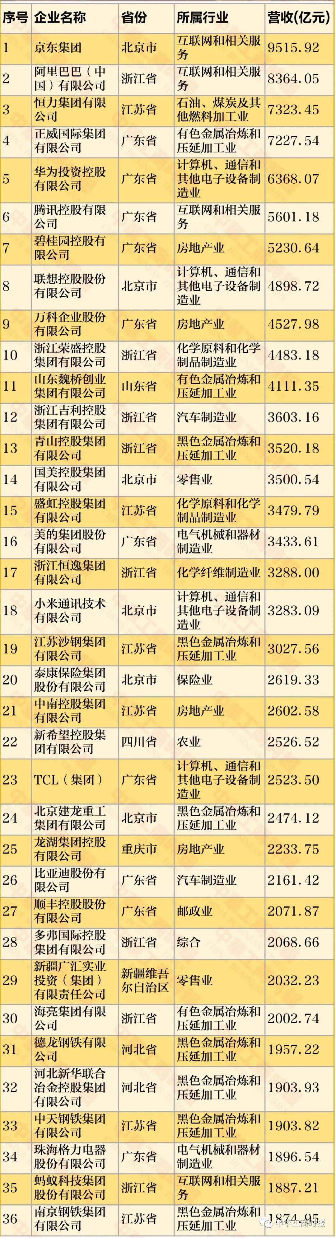 今年民营企业500强入围门槛达263.67亿元,比上年增加28.66亿元。19家500强企业营业收入超3000亿元,京东集团(9515.92亿元)、阿里巴巴(中国)有限公司(8364.05亿元)、恒力集团有限公司(7323.45亿元)、正威国际集团有限公司(7227.54亿元)、华为投资控股有限公司(6368.07亿元)等5家企业营业收入超过6000亿元。(第一财经记者 郭晋晖)
