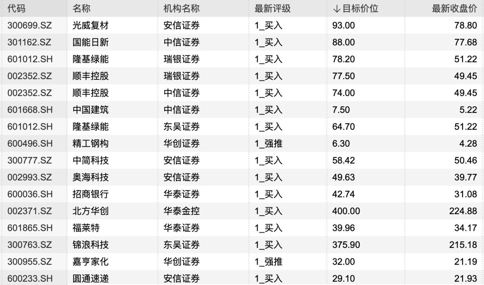 20:22【隆基绿能获目标价78.2元!机构今日看好这些个股】据统计,10月14日,机构共给出72次最新买入评级,其中26只个股目标价获公布:-隆基绿能、福莱特分别获目标价78.2元、39.96元;-顺丰控股获2家机构给出的目标价,瑞银证券给出目标价77.5元。