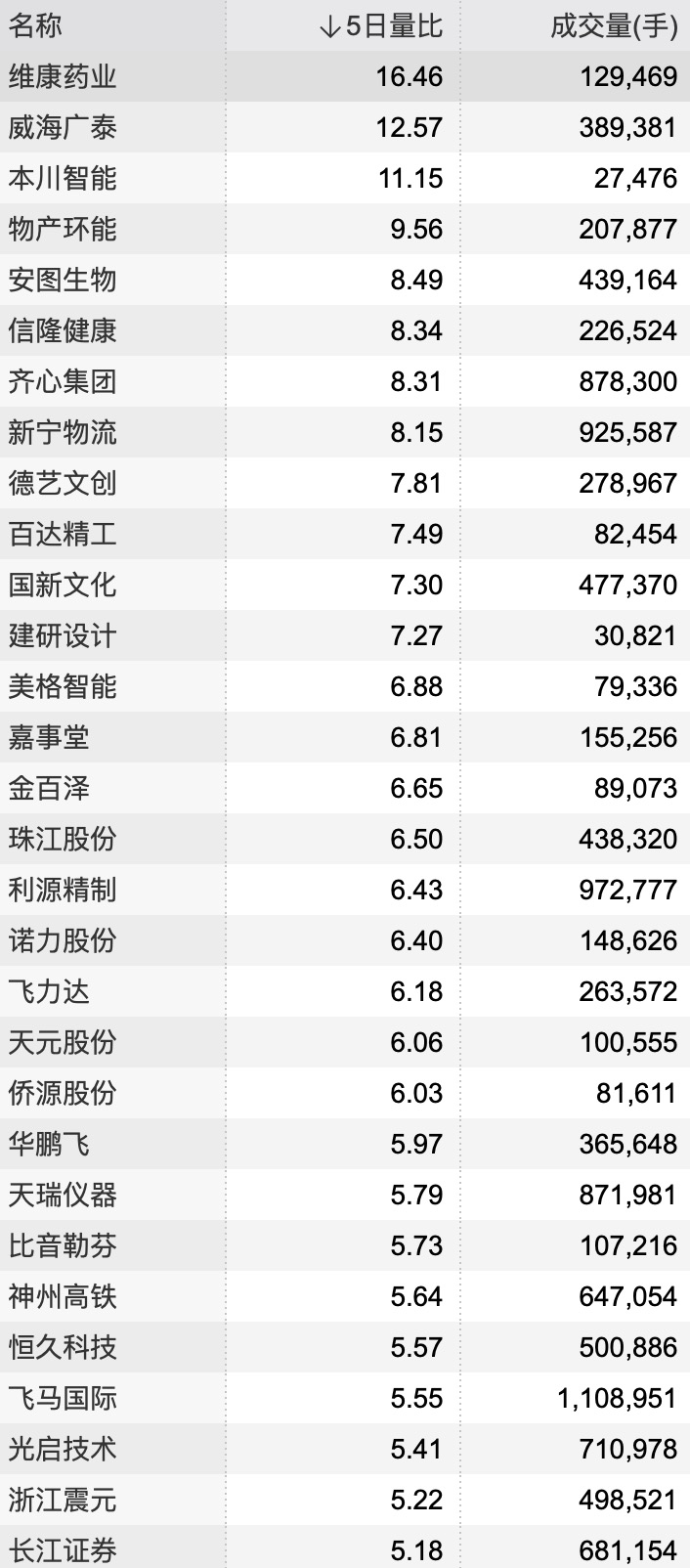 15:23【34只个股5日量比超过5倍】据Wind数据,截至10月18日收盘,共有34只个股5日量比超过5倍。其中维康药业量比达16.46倍,公司今日涨停;威海广泰、本川智能量比均超10倍。