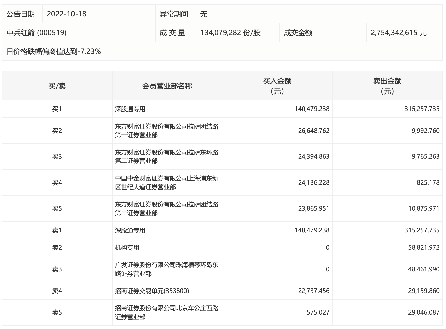 16:28【中兵红箭今日跌6.87% 深股通净卖出1.75亿】中兵红箭今日跌6.87%,成交额27.54亿元,换手率9.64%,盘后龙虎榜数据显示,深股通净卖出1.75亿,1家机构专用席位净卖出5882.20万元。