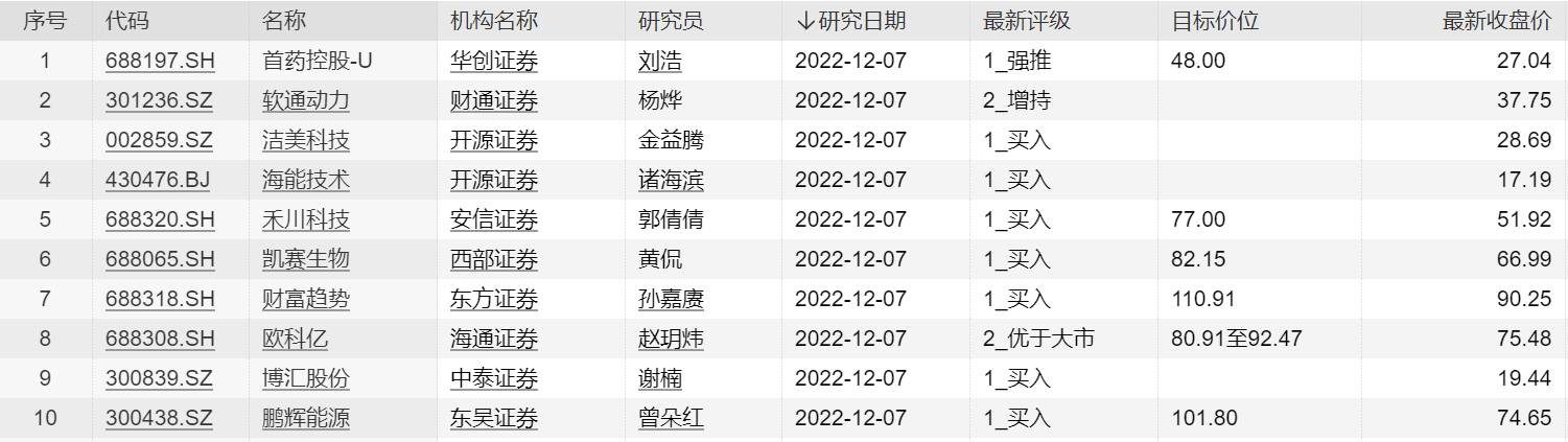 21:19【机构今日首次关注10只个股 这只股获“强推”】Wind数据显示,机构今日首次关注10只个股,其中首药控股获华创证券“强推”评级,目标价48元;禾川科技获安信证券“买入”评级,目标价77元;欧科亿获海通证券“优于大市”评级,目标价80.91-92.47元;软通动力、洁美科技、海能技术等均获机构推荐。