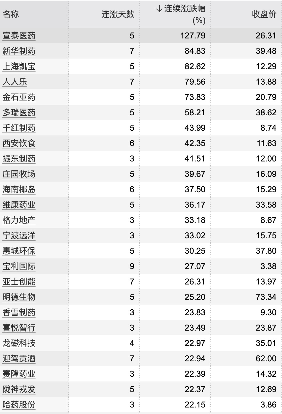 15:40【16只个股连续上涨6个交易日及以上】Wind数据显示,截至12月13日收盘,16只个股连续上涨6个交易日及以上,金枫酒业连续上涨13天,宝利国际、立达信连涨9天。从连续涨跌幅来看,宣泰医药连涨期间累计涨幅达127.79%,新华制药累计涨幅达84.83%。