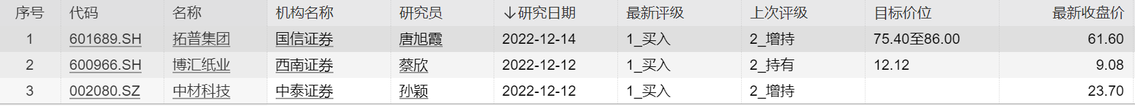 21:45【机构近五日调高这3股评级】Wind数据显示,机构近五日共调高3只个股评级,其中拓普集团获国信证券“买入”评级,目标价75.4-86元;博汇纸业获西南证券“买入”评级,目标价12.12元;中材科技获中泰证券“买入”评级。