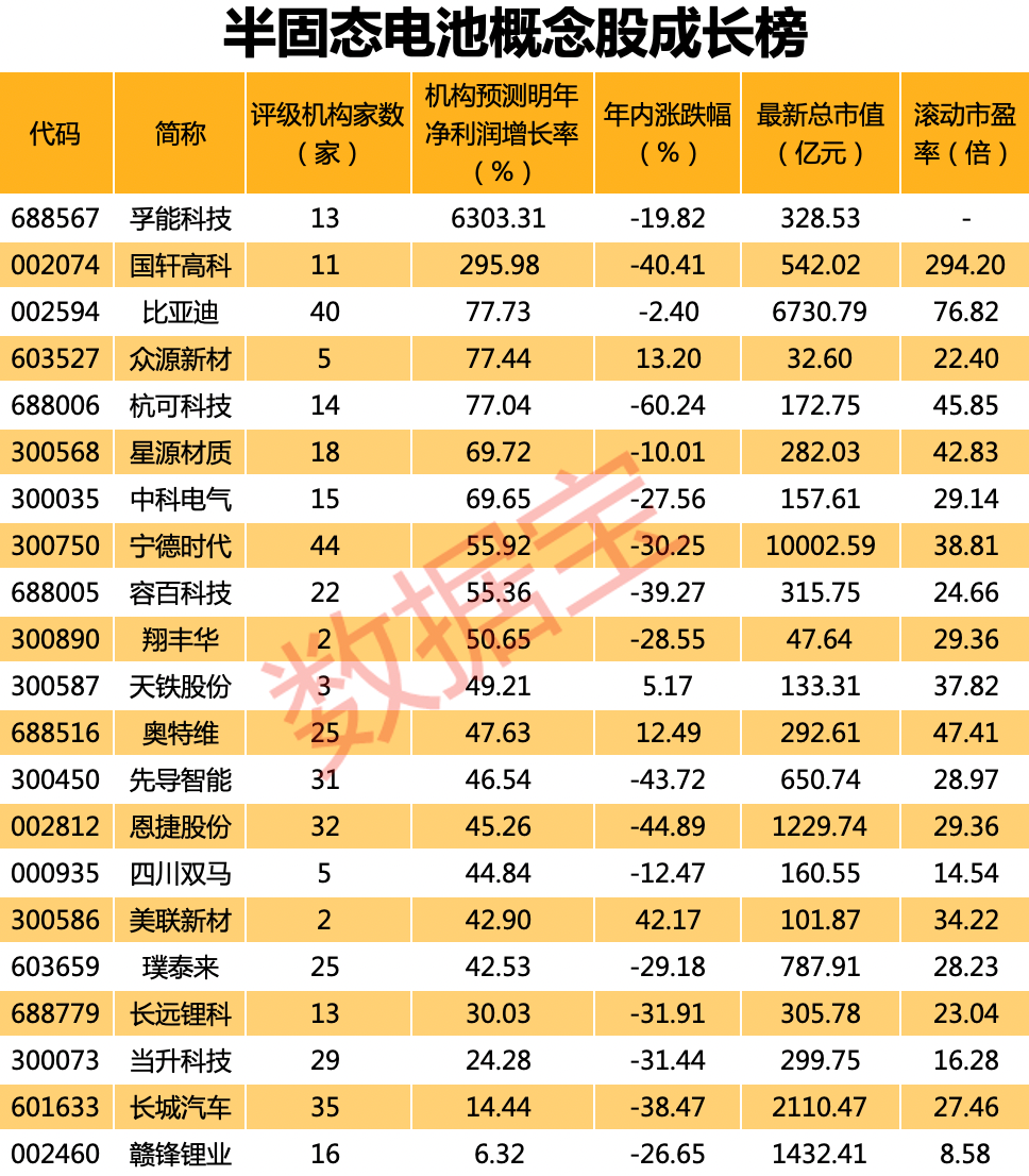 半固态电池是全固态电池的过渡路线,在固态电池正式商业化还有10多年的时间里,半固态电池装车潮可能会出现。从机构预测明年净利增速来看,孚能科技明年净利有望大幅扭亏,接近15亿元,该股今年机构一致预测净利为亏损2383万元。其他个股方面,国轩高科、比亚迪、众源新材等个股机构一致预测明年净利增速均超过50%。(数据宝)