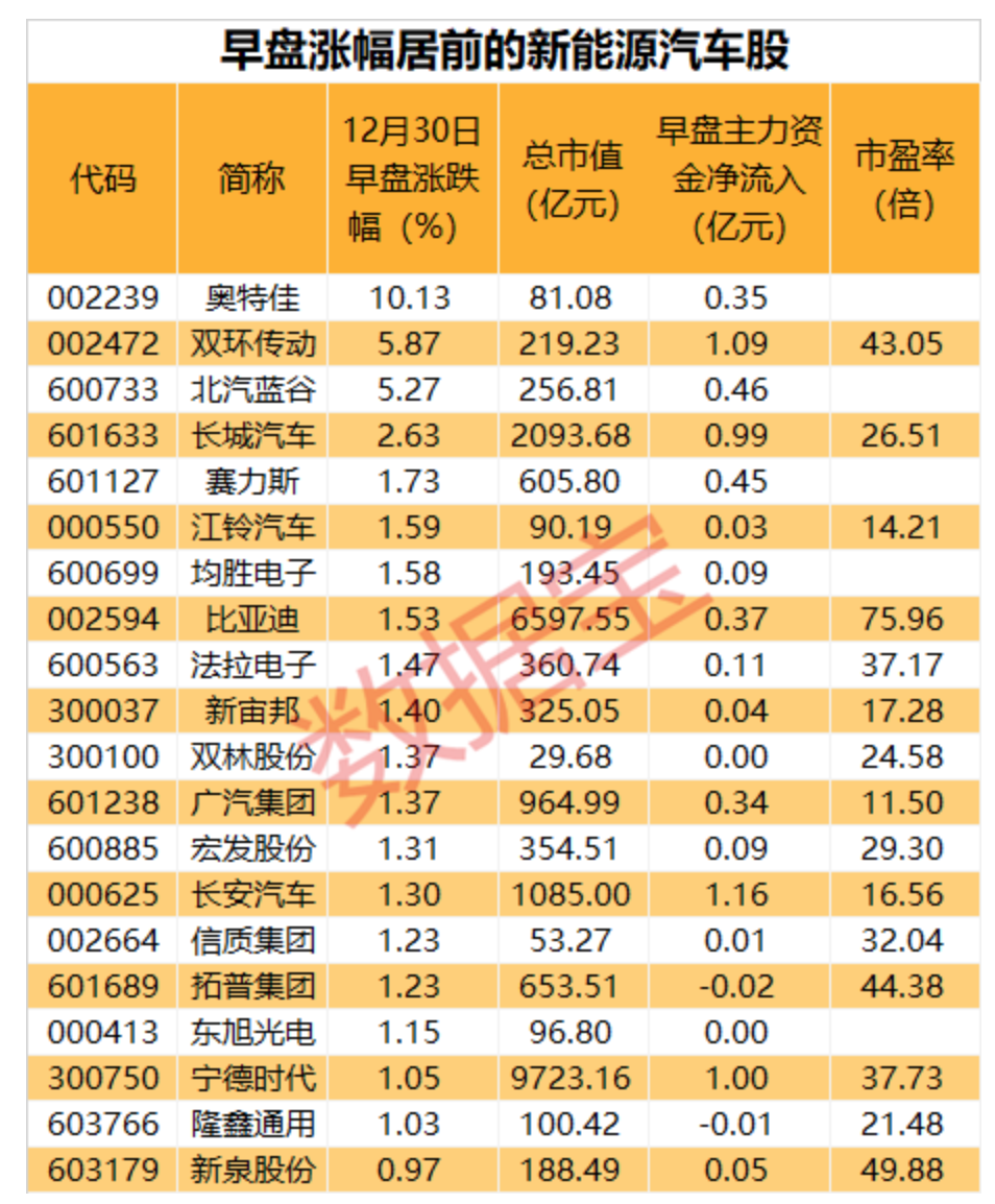 据统计,A股中布局新能源汽车产业链的个股有59只,早盘38股上涨,奥特佳涨停,双环传动、北汽蓝谷涨幅居前,均超过5%。