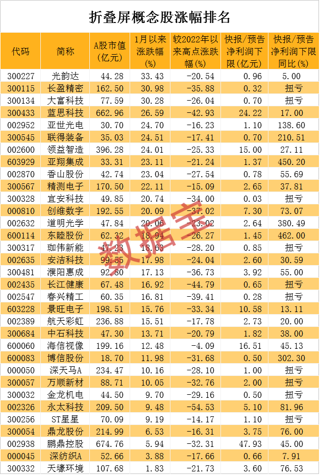 按照最新公布的业绩快报、预告净利润下限计算,折叠屏概念股中,2022年净利润预喜的占比不到半数。6股净利润预计翻倍增长,包括东睦股份、亚翔集成、道明光学、博信股份、联得装备、亚世光电。