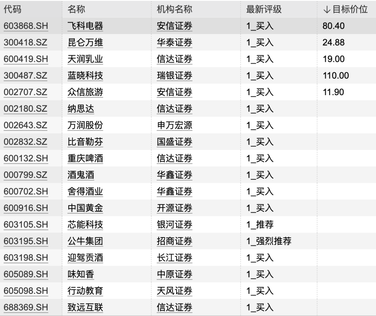 21:06【机构今日看好这些个股】据统计,2月9日,机构共给出18次最新买入评级,其中5只个股目标价获公布:- 蓝晓科技获瑞银证券看好,目标价110元;- 飞科电器获安信证券青睐,目标价80.40元;- 重庆啤酒、味知香、酒鬼酒、舍得酒业、迎驾贡酒等多只酒类股在列。