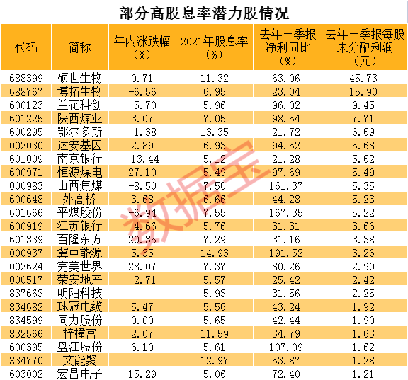 13:06【高股息率潜在股曝光】记者梳理出尚未披露年报但有望实现高股息率的个股,这类股票未来有望跑赢大盘。2021年股息率超5%的个股中,有23只个股去年三季报净利同比增长超20%且尚未披露年报。这些个股有望延续高股息率。其中,冀中能源、鄂尔多斯、艾能聚、梓橦宫、硕世生物等个股2021年股息率均超11%。