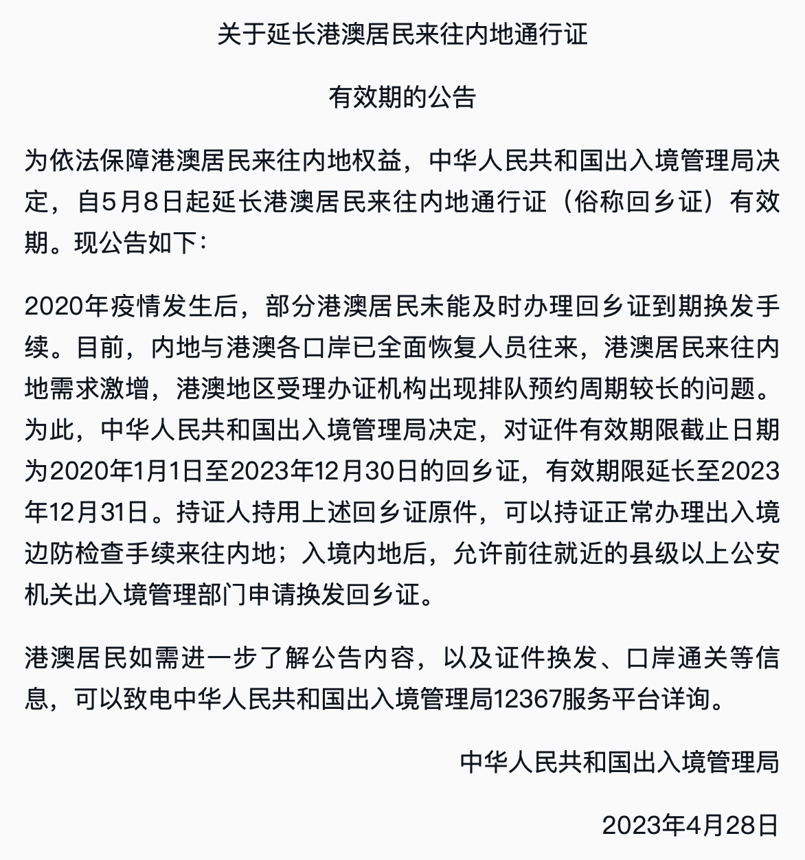 09:04【出入境管理局:延长港澳居民来往内地通行证有效期】为依法保障港澳居民来往内地权益,中华人民共和国出入境管理局决定,自5月8日起延长港澳居民来往内地通行证的有效期。