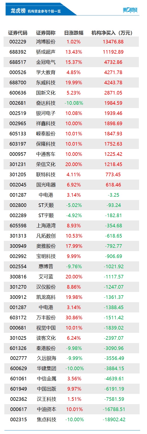 当天机构净买入前三的股票分别是鸿博股份、骄成超声、金冠电气,净买入金额分别是1.35亿元、1.12亿元、4733万元。
