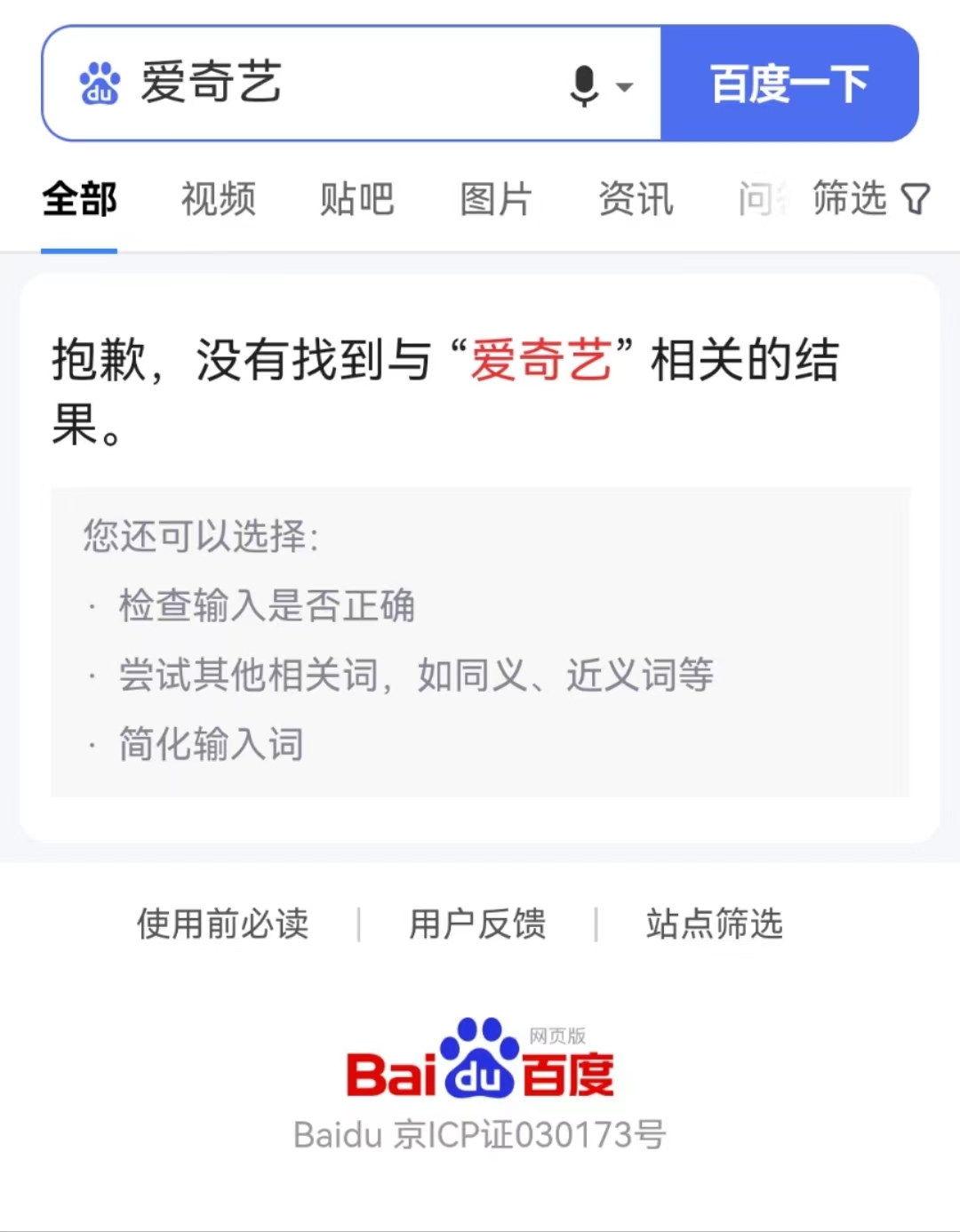 21:11【百度搜不到爱奇艺:没有找到相关结果】今日晚间,有网友反馈,百度搜不到爱奇艺。小编实测发现,在百度搜索爱奇艺后提示“抱歉,没有找到与爱奇艺相关的结果”。不过,输入“iqiyi”、“爱奇”或“奇艺”则可以正常跳出搜索结果。