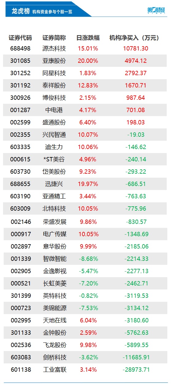 当天机构净买入前三的股票分别是源杰科技、亚康股份、同星科技,净买入金额分别是1.08亿元、4974万元、2792万元。