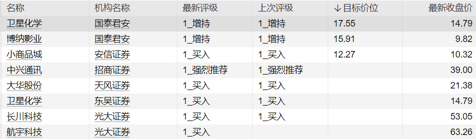 14:20【机构今日看好这些个股】据统计,6月19日,截至发稿,机构共给出8次最新买入评级,其中3只个股目标价获公布:-博纳影业获国泰君安给予“增持”评级,目标价为15.91元;-小商品城获安信证券青睐,目标价为12.27元;-卫星化学、中兴通讯、大华股份等多只个股在列。