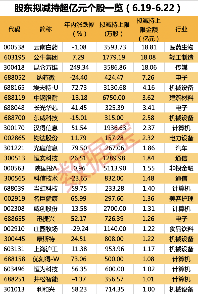数据宝统计,6月19日至22日,共58股公布了股东拟减持计划公告。从拟减持金额(拟变动数量上限乘以最新收盘价或协议价)来看,股东拟减持市值合计122.83亿元,其中云南白药、公牛集团、昆仑万维金额居前,分别为18.81亿元、18.08亿元、18.06亿元。从减持比例来看,北交所个股科创新材股东拟减持19.04%,居首位;其次为埃夫特-U、中钢洛耐、井松智能,减持均为6%。(数据宝)