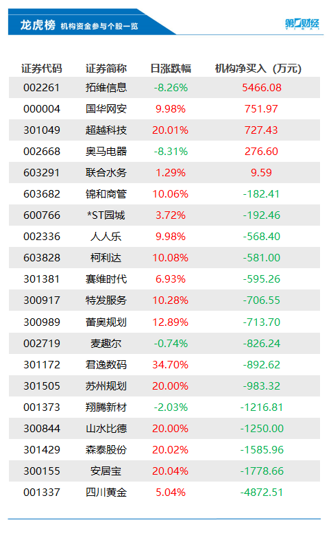 当天机构净买入前三的股票分别是拓维信息、国华网安、超越科技,净买入金额分别是5466万元、752万元、727万元。