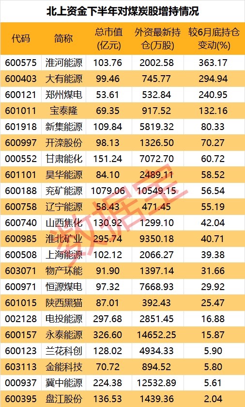 下半年以来,北上资金对多只煤炭股有增持动作。从持仓变动来看,淮河能源、大有能源、郑州煤电和宝泰隆的最新持仓较6月底翻倍,其中淮河能源增幅居首,高达363.17%,北上资金最新持有2002.58万股。
