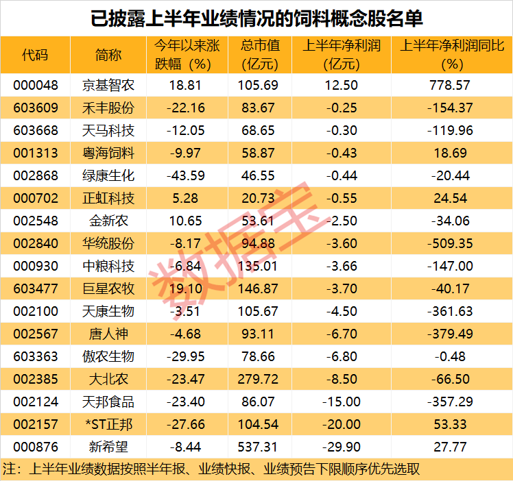 A股中,饲料概念股年内股价平均下跌7.95%,表现弱于大盘;播恩集团、巨星农牧、京基智农、金新农的年内股价累计上涨幅度居前,均超10%。目前已有17只饲料概念股发布了上半年业绩情况,按照半年报和业绩预告下限数据进行统计,仅京基智农上半年实现盈利;公司预计业绩扭亏,预测净利润约12.5亿元~13.5亿元,较去年同期净利润亏损1.84亿元,变化约为778.57%~832.86%。天邦食品、*ST正邦、新希望上半年的业绩亏损额居前,均超10亿元。新希望亏损金额最大,公司预测业绩续亏,净利润约-29.9亿元至-27.9亿元,较去年同期减亏。(数据宝)